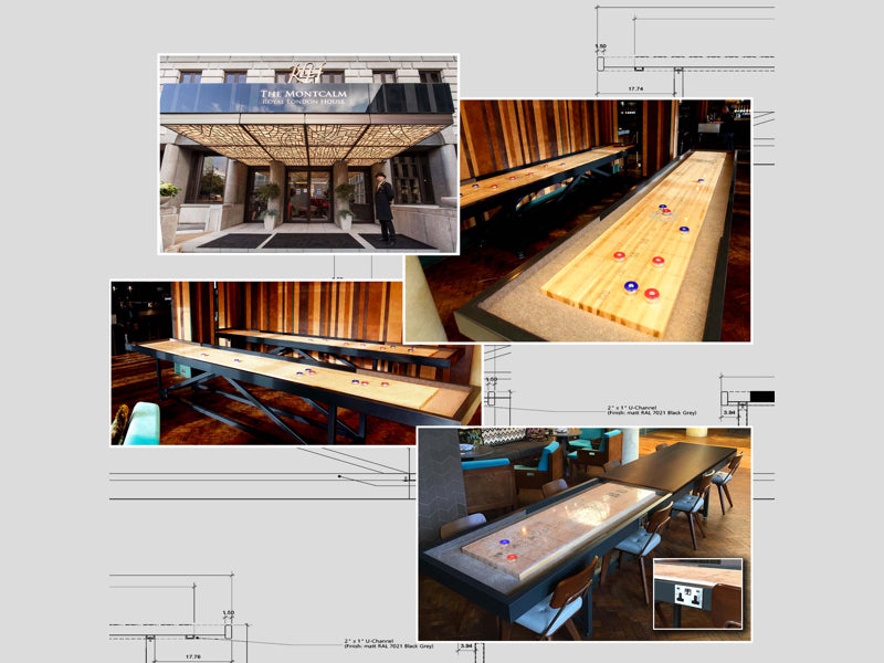 The cool new Montcalm hotel in Finsbury Square commissioned two 14 ft. Lancaster shuffleboards from The Games Room Company, both of which needed to be on casters to allow access to the cupboards behind. They rent a set of pucks out to the customers by the half hour. A third shuffleboard with removable tops was added a few months later, incorporating mains/USB charging points. This is used as a dining table/workstation during the day.