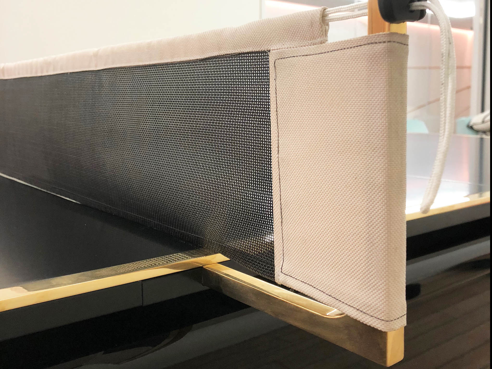 Many of our tables feature brass, bronze, or polished steel inlays between the cushions and the rails, which provide a striking accent and really lift the piece into the realms of luxury. The same metal is used for the table tennis net posts, and these are custom cut for each table using a high pressure water jet to avoid the discolouration associated with laser cutting.