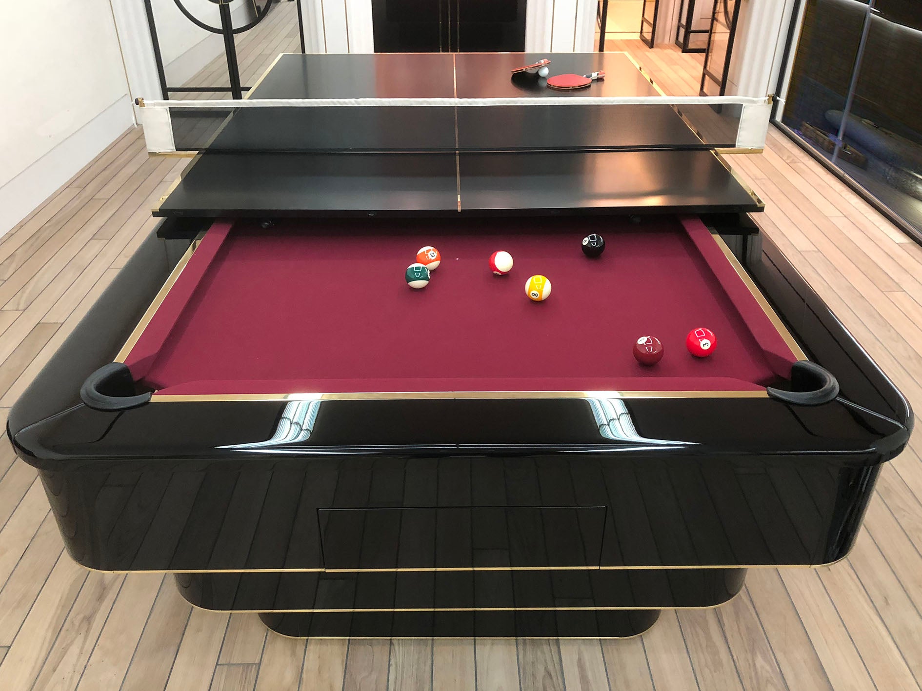 The Olympian was the first bespoke pool table we created and is perhaps the most imposing of our designs, as this gloss black example in a South Kensington basement shows. Note the aforementioned polished brass trim inlays on the rails, lower edges of the skirts, and also on the table tennis tops.