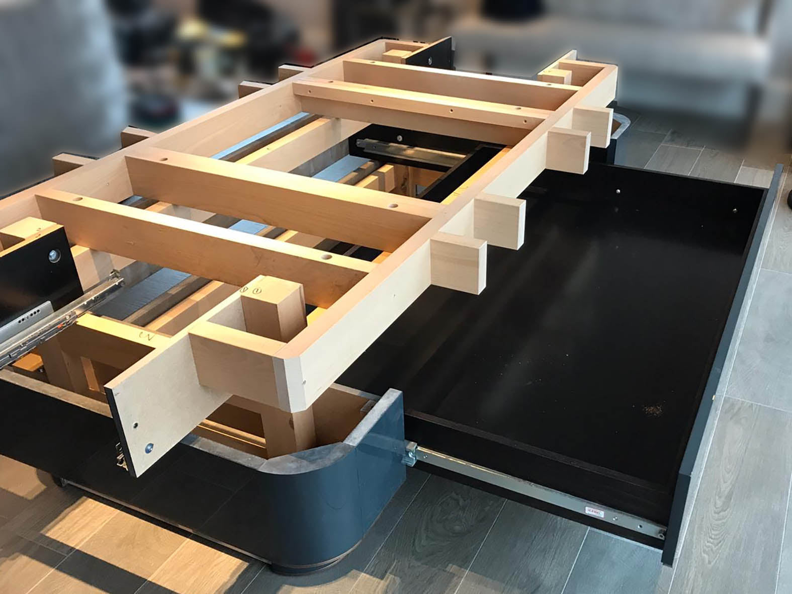 One of the reasons clients choose our designs is because we've developed an ingenious way of concealing the table tennis tops when not in use. These are stored in a large drawer which runs smoothly on incredibly strong aviation grade runners, and extends far enough out to allow easy access.