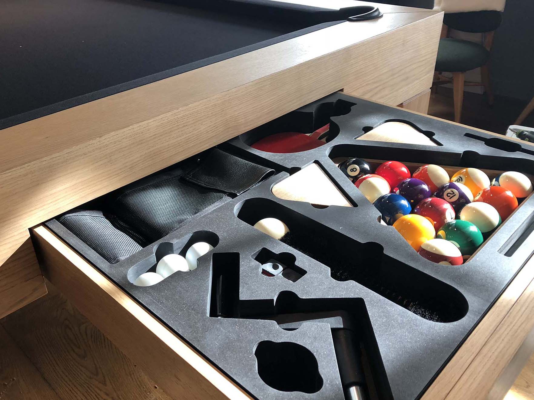 At either end of our bespoke tables you'll find a concealed 'soft close' drawer, which houses all the pool and table tennis accessories you'll need to enjoy both games. Also stored here are the table tennis net posts, which like all the other accessories are held securely in custom formed CNC cutout recesses.