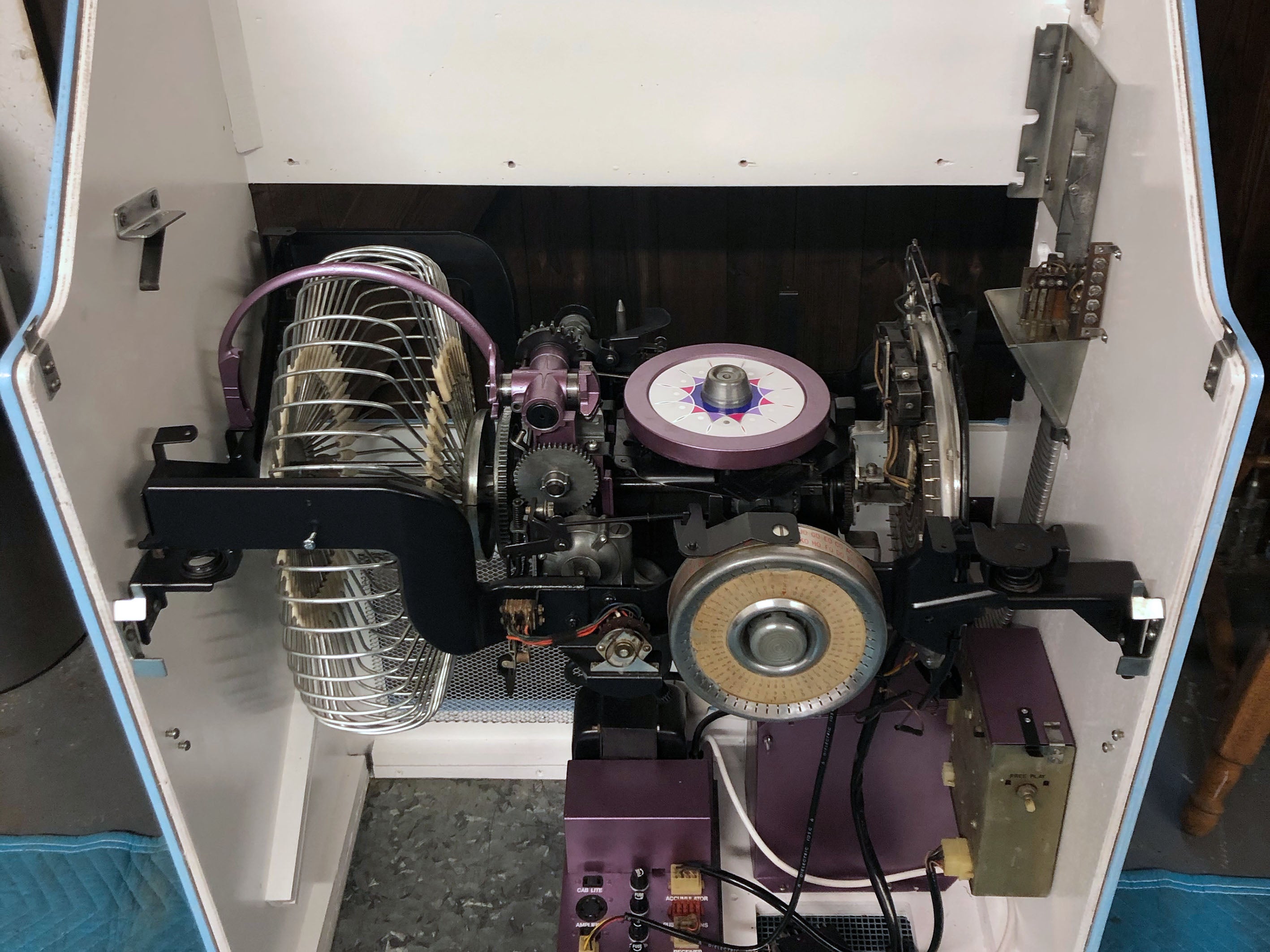 During the restoration process we clean all areas of the mechanism, strip back the amplifier and clean the chassis, capacitors, leads and replace anything that needs to be, including capacitors. We also need to set the jukebox to free play. Our ultimate aim is to ensure she plays and sounds as our clients would expect.