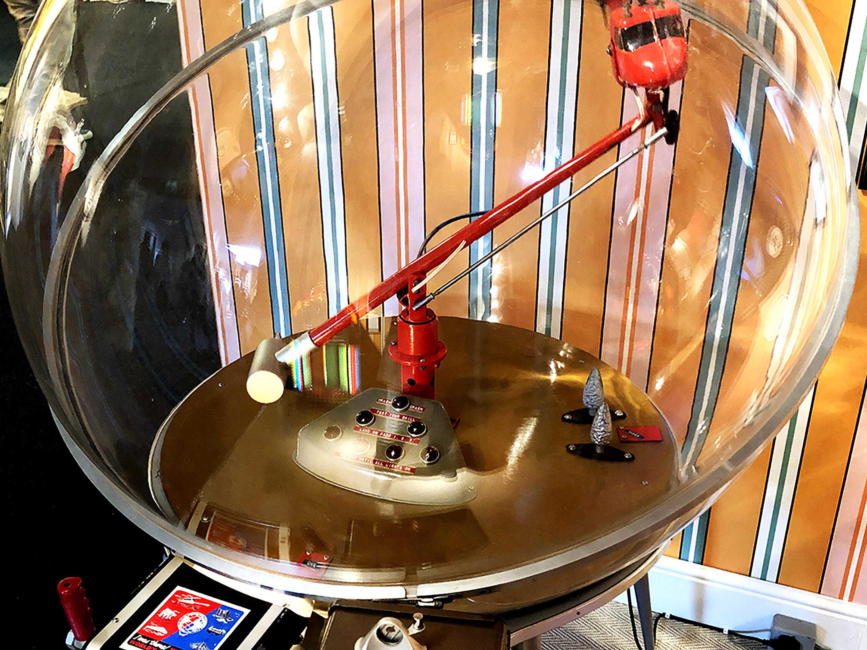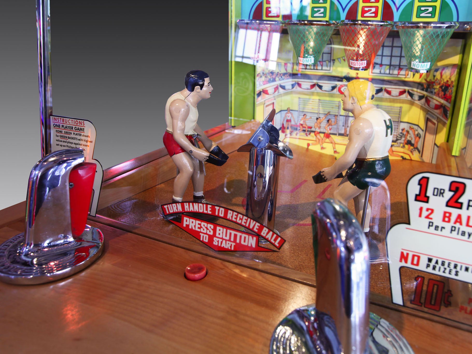 A vintage machine hailing from the 1950s, the Genco Basketball Arcade houses a miniature basketball court home to two mannequin players. When the game begins, a central loading tube feeds out the balls to the players, who are controlled by joysticks on the Genco’s outer casing. Such fun!